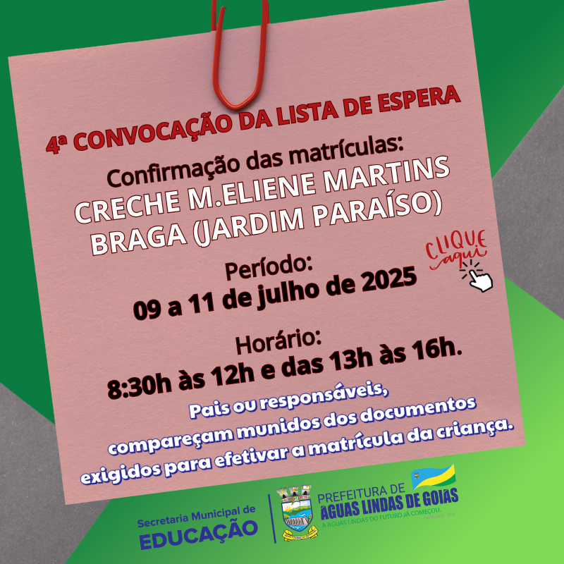 A Secretaria Municipal de Educação de Águas Lindas de Goiás informa que está aberto o 4º Chamamento Oficial para a efetivação das matrículas das crianças contempladas no cadastro reserva.